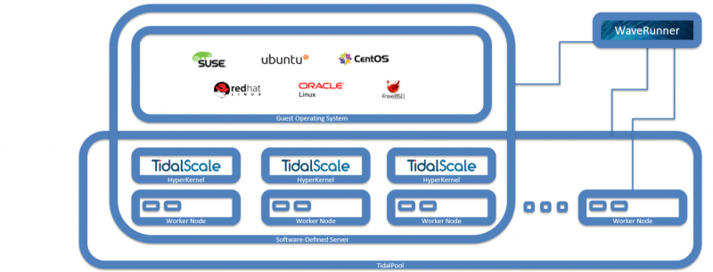 Todo o sistema é controlado por um servidor WaveRunner em execução em uma máquina física ou virtual. Ele fornece ao usuário uma interface da Web e uma API RESTful. O WaveRunner permite combinar vários hosts físicos (Nós do Trabalhador), onde a camada de virtualização do HyperKernel funcionará, no pool do TidalPool, onde as máquinas virtuais (SDS) são iniciadas.
