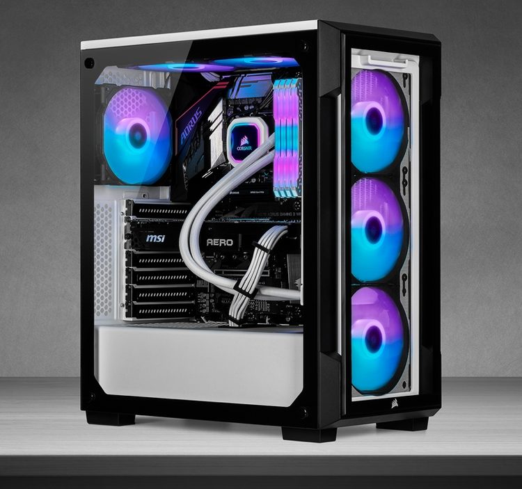 Os painéis lateral e frontal são feitos de vidro temperado. Na parte frontal, três ventoinhas SP120 RGB Pro com um diâmetro de 120 mm são instaladas inicialmente com uma luz de fundo RGB endereçável baseada em oito LEDs. Os resfriadores são conectados ao controlador de luz de fundo do iCUE Lighting Node Core e podem ser controlados usando o aplicativo iCUE.