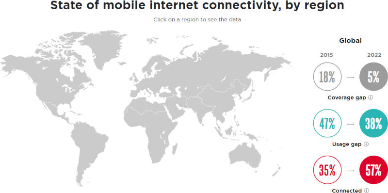 O relatório da GSMA observa disparidades regionais na disponibilidade de Internet móvel: 69% dos proprietários de smartphones na América do Norte e no Leste Asiático possuem dispositivos habilitados para 4G, enquanto a maioria dos utilizadores em África e no Médio Oriente continuam a utilizar redes 3G. A Internet móvel continua a se espalhar ativamente, mas cerca de 3,4 bilhões de pessoas ainda não têm conexão com ela; 38% da população mundial vive em regiões onde a Internet móvel está presente, mas não a utiliza. 59% da população da África Subsaariana e 52% da população do Sul da Ásia não têm acesso à Internet.