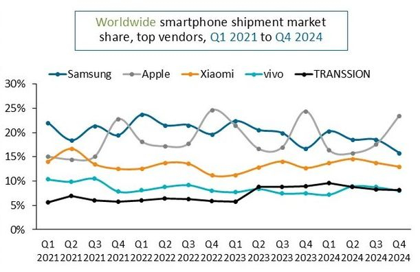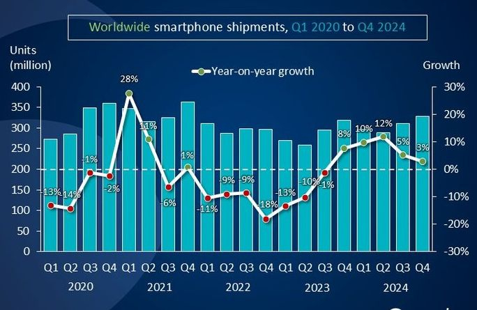 Tendo afundado no terceiro trimestre de 2021, o mercado global de smartphones conseguiu voltar a crescer apenas no quarto trimestre do ano retrasado, e se até ao segundo trimestre de 2024 inclusive aumentou a sua taxa de crescimento, atingindo um pico de 12 %, então no terceiro trimestre o crescimento já estava limitado a 5%, e no quarto diminuiu para 3%. De uma forma ou de outra, aproximadamente 330 milhões de smartphones foram enviados ao mercado global no quarto trimestre. No final de 2024, as remessas de smartphones cresceram 7%, para 1,22 mil milhões de unidades, permitindo à Apple ultrapassar a Samsung Electronics como maior fornecedor de smartphones pelo segundo ano consecutivo.
