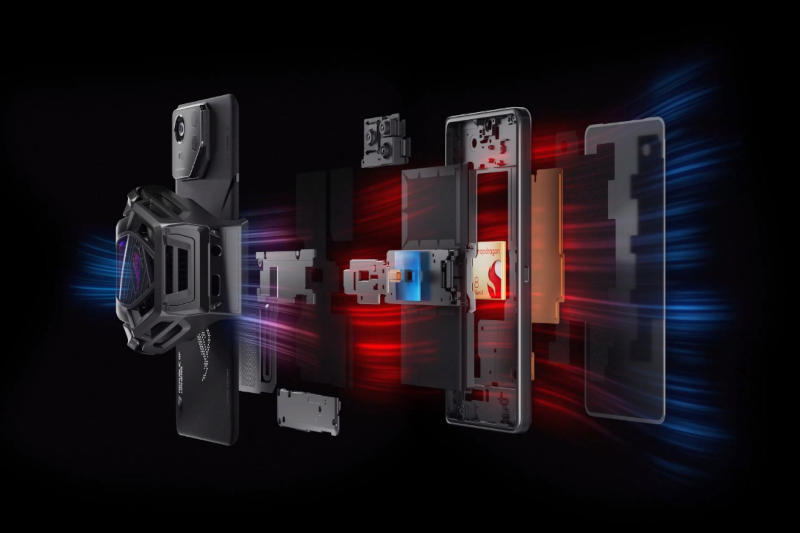 A fabricante também destacou que o ROG Phone 8 se tornou o primeiro modelo à prova d’água da linha com proteção IP68 – no ano passado tinha classificação IP54. O sistema de resfriamento é importante para um telefone para jogos, e aqui ocorreram mudanças: o resfriamento convectivo foi substituído pelo resfriamento condutivo. Uma placa de cobre passa pela placa-mãe, que fica adjacente ao painel traseiro – aqui o calor é removido por troca natural de calor com o ar ou usando um cooler ativo removível, AeroActive Cooler X. Tornou-se 29% mais compacto em volume e 10 % isqueiro. A área de contato aumentou 2,6 vezes, a velocidade de rotação do ventilador aumentou 1,1 vezes e a eficiência térmica aumentou 1,2 vezes.