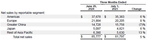 Analistas independentes já notaram que este ano, pela primeira vez em vários anos, a Apple não conseguiu entrar entre os cinco maiores fabricantes de smartphones do mercado chinês. O relatório trimestral, que reportou uma queda anual de 7% nas receitas regionais, também enviou sinais alarmantes sobre o declínio da procura pelos produtos da marca na China. Todas as outras macrorregiões de presença da Apple aumentaram suas receitas.