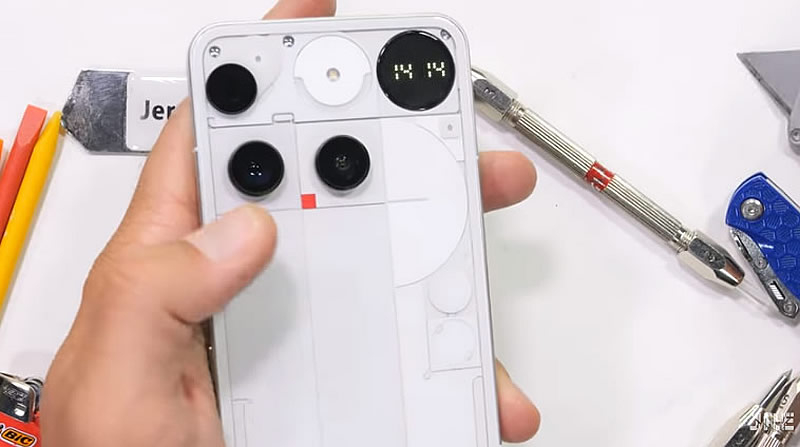 Durante a desmontagem, também foi descoberto que o painel traseiro estava fixado com cola forte, sendo necessária uma lâmina de barbear para removê-lo. A câmera de três módulos de 50 megapixels e o display Glyph Matrix de 489 LEDs controlados individualmente fazem parte do painel traseiro de vidro, sob o qual há uma tela protetora adicional que protege os componentes internos. Isso explica por que o design transparente não revela uma visão completa do “interior” do dispositivo. Ao final do teste, o dispositivo foi remontado e ligado com sucesso – continuou funcionando sem falhas.