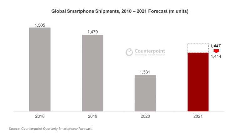 A Counterpoint Technology Market Research é forçada a reduzir sua previsão de remessas de smartphones neste ano. O motivo é a escassez observada de componentes eletrônicos.