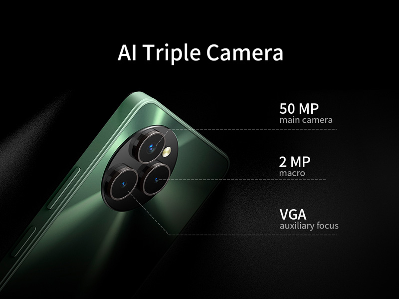 Na parte traseira do smartphone há uma câmera com sensor principal de 50 megapixels com abertura f/1.8, complementada por uma câmera macro de 2 megapixels e um sensor de profundidade de 2 megapixels, proporcionando fotos e vídeos de alta qualidade. A câmera frontal com resolução de 8 megapixels permitirá tirar selfies, além de fazer videochamadas e participar de videoconferências.