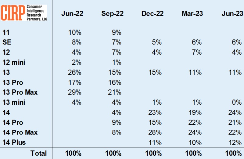 A família iPhone 14 representava 79% de todos os smartphones americanos atualmente oferecidos pela Apple. Este é o valor mais alto para a geração atual do iPhone desde o recorde de vendas da linha iPhone 7, que em 2017 ocupou 81% do mercado, segundo a empresa de análises CIRP.