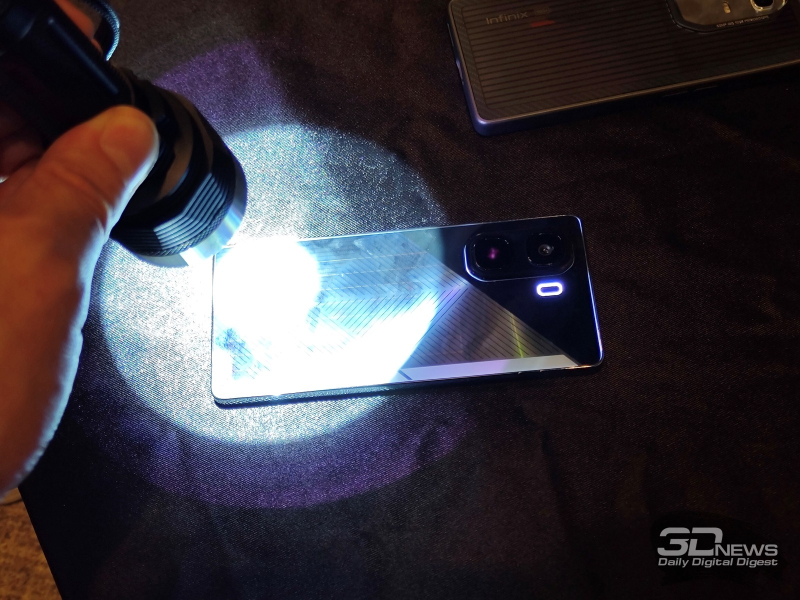 Ao mesmo tempo, a Infinix mostrou um smartphone de segunda geração com um painel E-Ink embutido na tampa traseira. Na versão anterior do dispositivo, o painel traseiro mudava de cor apenas quando conectado à rede. Agora ele é alimentado por uma bateria interna e pode ser personalizado para exibir diferentes padrões e cores.