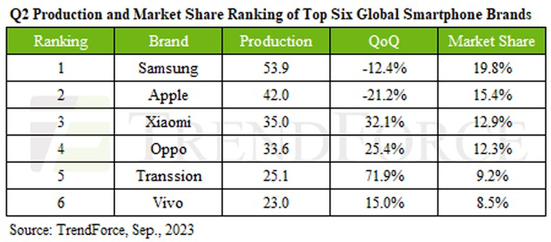 A Transsion (marcas TECNO, Infinix e Itel) ultrapassou pela primeira vez a Vivo na quinta posição no ranking global de fabricantes de smartphones com 25,1 milhões de unidades vendidas. O crescimento das vendas em relação ao primeiro trimestre foi recorde de 71,9%. O alto volume de produção da Transsion foi possível graças ao reabastecimento dos clientes, ao lançamento de novos produtos e à entrada da empresa em mercados de médio a alto padrão. O crescimento da empresa provavelmente continuará no terceiro trimestre.