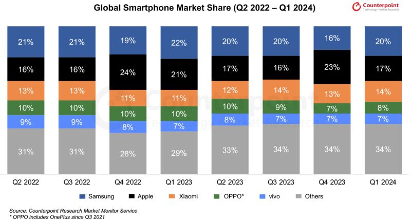 Os especialistas da Counterpoint Research aderem à informação sobre uma diminuição nas remessas de iPhone em 13%, para 50,5 milhões de unidades no primeiro trimestre, o que, combinado com a relativa estabilidade das remessas de smartphones Samsung durante o mesmo intervalo, permite-nos falar sobre a vingança do Sul. Gigante coreana, que conseguiu reconquistar o primeiro lugar no mercado global com uma participação de 20% contra 17% da Apple.