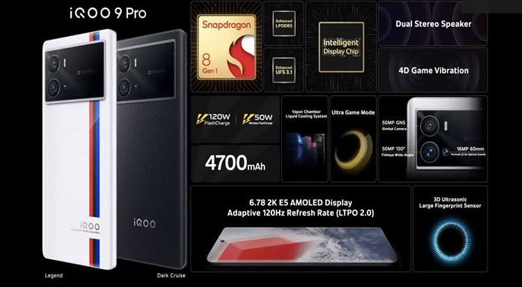 A câmera principal do smartphone é baseada em um sensor Samsung GN5 de 50 megapixels, complementado por uma câmera ultra grande angular de 50 megapixels com campo de visão de 150° e um sensor de 12 megapixels para retratos. A resolução da câmera frontal é de 16 megapixels. A bateria de 4700 mAh suporta carregamento rápido de 120 W, bem como carregamento sem fio de 50 W e carregamento reverso de 10 W. O iQOO 9 Pro com 12 GB de RAM e 512 GB de armazenamento custará cerca de US$ 945.