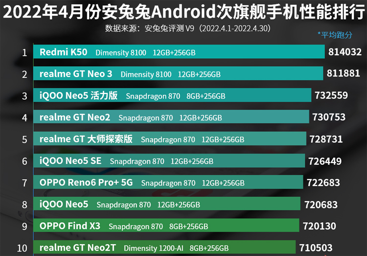 Deve-se notar que nove dos dez dispositivos mais poderosos usam o processador Qualcomm Snapdragon 8 Gen 1. Outro dispositivo, o modelo Vivo X80 (quarta posição), é baseado no chip MediaTek Dimensity 9000.