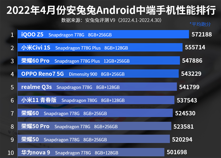 Quanto aos smartphones de gama média, o iQOO Z5 com chip Snapdragon 778G está na liderança aqui: o dispositivo marcou 572.188 pontos. Em geral, essa classificação se parece com isso: