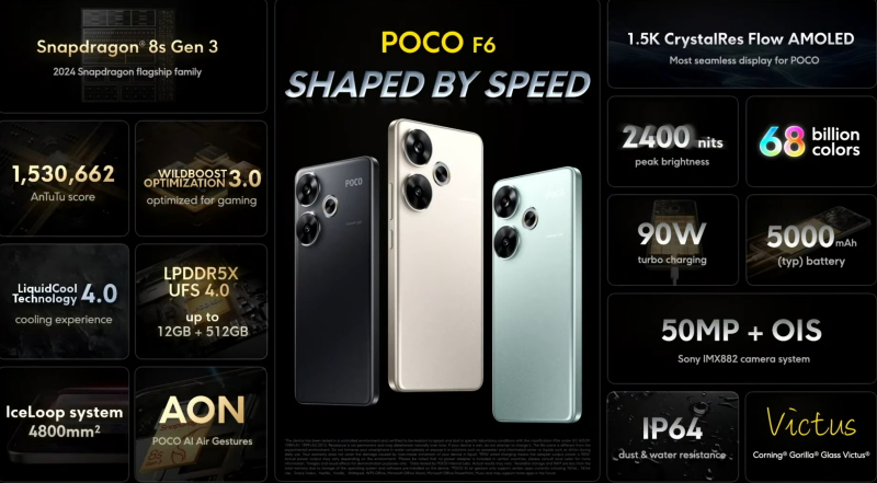 Por sua vez, o smartphone Poco F6 é construído sobre um processador Snapdragon 8s Gen 3 com velocidade de clock de até 3,0 GHz, fabricado com tecnologia de processo de 4 nm da TSMC. Combinado com a tecnologia WildBoost Optimization 3.0 e recursos de IA, o chip oferece uma jogabilidade suave com visuais mais detalhados e realistas que são suportados por jogos de RPG populares. A quantidade de RAM LPDDR5X é de até 12 GB, a memória flash UFS 4.0 é de até 512 GB.