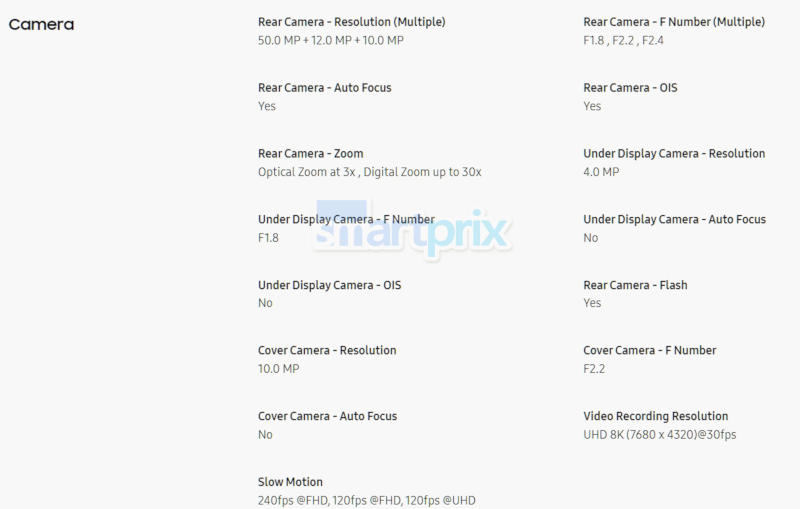 O trio de câmeras principais oferecerá uma principal de 50 megapixels (f/1.8, estabilização óptica, suporte para gravação de vídeo em resolução 8K a 30 quadros por segundo); 10 megapixels com lente telefoto com zoom 3x e estabilização ótica; bem como uma ultra grande angular de 12 megapixels (120°). A tela externa abrigará uma câmera frontal de 10 megapixels e a tela interna abrigará uma câmera de 4 megapixels.