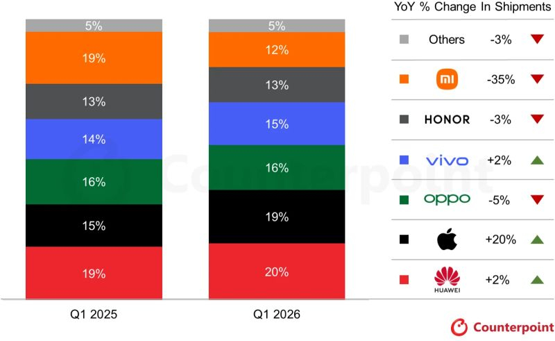 Todas as outras empresas no mercado chinês estão empatadas com 5% de participação, com uma queda de 3% nas vendas no primeiro trimestre. Os especialistas da Counterpoint Research esperam que a demanda por smartphones continue a diminuir este ano devido ao aumento dos preços, mas as vendas sazonais de junho na China podem proporcionar um impulso temporário. Mesmo que as remessas de smartphones na China diminuam 9% até o final de 2026, o mercado regional ainda terá um desempenho superior ao do mercado global.