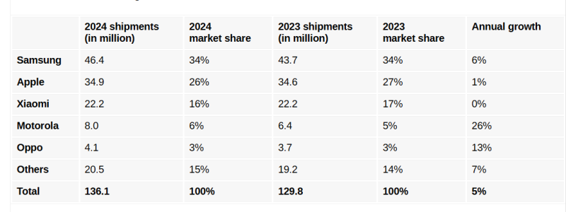 A Samsung manteve sua liderança no mercado europeu, aumentando as vendas ano a ano em 6%, para 46,4 milhões de unidades. Nisso, ela foi ajudada pelos smartphones da série Galaxy S24, que foram ativamente anunciados durante os Jogos Olímpicos de Paris.
