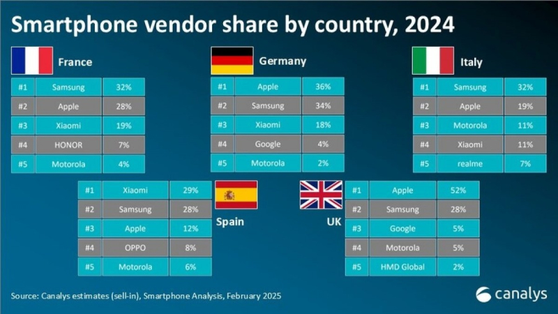 Analisando as remessas por país, os analistas relataram que as remessas da Apple foram quase duas vezes maiores que as da Samsung no Reino Unido (52% contra 28%). E na Espanha, a Xiaomi saiu na frente, à frente da Samsung e da Apple, que caiu para o terceiro lugar.