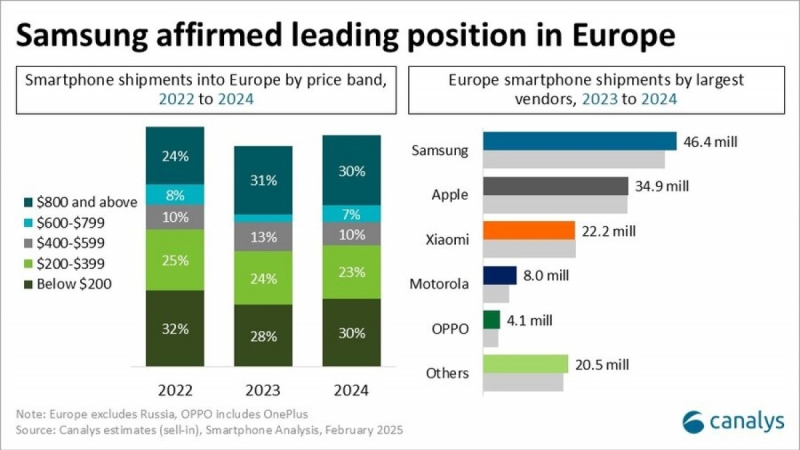 A Canalys disse que a Oppo voltou a crescer após dois anos difíceis graças ao aumento das vendas no sul da Europa – Espanha, Itália, Romênia e Portugal. Honor e Realme registraram crescimento de dois dígitos, “aumentando a concorrência e criando entusiasmo no canal e entre os consumidores”, disse a Canalys em um estudo. Os analistas também observaram que, em 2024, o maior número de dispositivos premium com preços de US$ 800 ou mais foi vendido: 41 milhões, o que representa 30% do total.