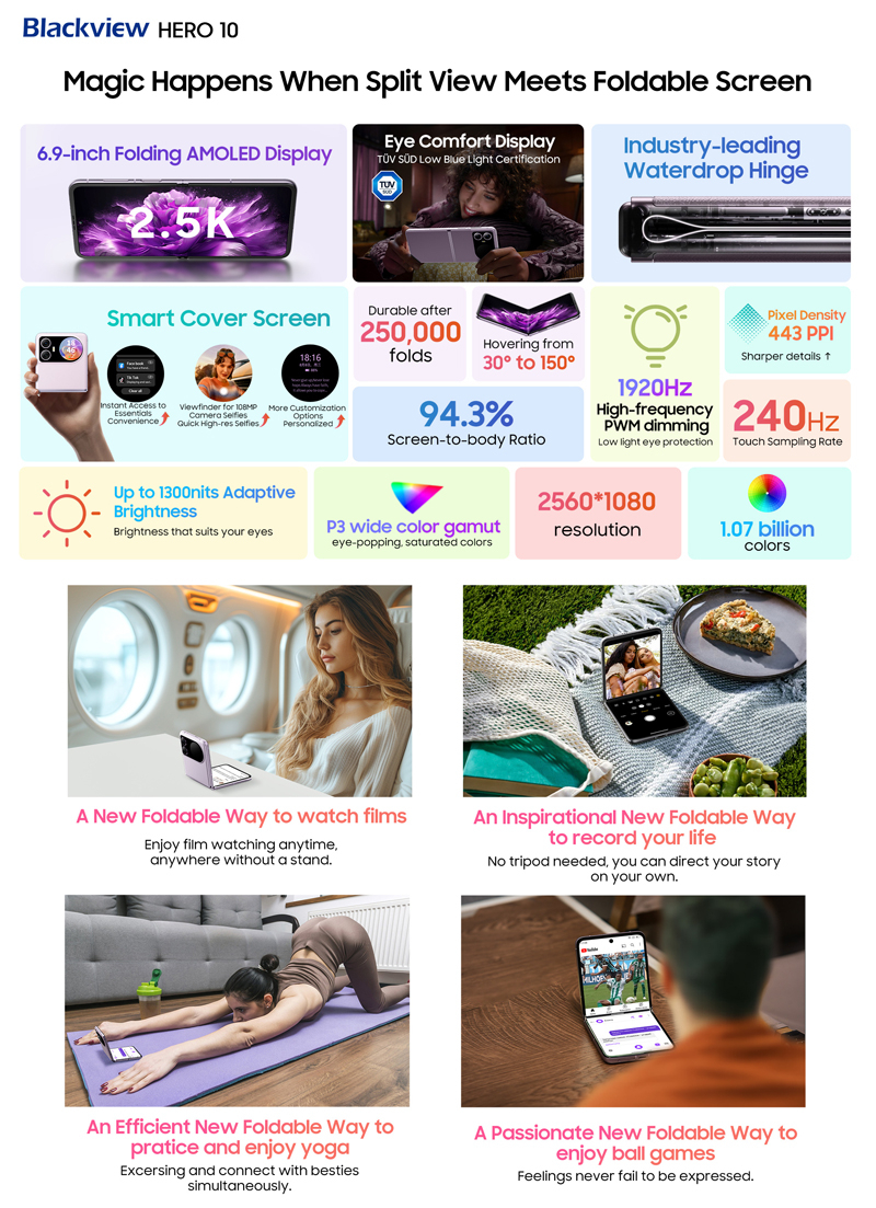A Blackview também lançou recentemente o acessível smartphone dobrável Hero 10 com uma tela AMOLED flexível de 6,9 polegadas com resolução de 2560 × 1080 pixels e controle de brilho de luz de fundo PWM a 2160 Hz. Segundo a fabricante, o smartphone aguenta cerca de 250 mil dobras, ou seja, foi projetado para aproximadamente mais de 15 anos de uso.