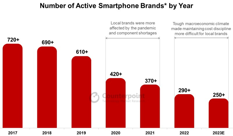 Uma base de utilizadores crescente, a melhoria da qualidade dos dispositivos, ciclos mais longos de substituição de dispositivos, dificuldades económicas, estrangulamentos na cadeia de abastecimento e grandes transições tecnológicas, como 4G para 5G, reduziram gradualmente o número de marcas ativas ao longo dos anos. Muitos fabricantes locais de smartphones, como a Micromax na Índia e a Symphony no Bangladesh, perderam uma quota significativa ou até saíram do mercado nos últimos cinco anos.