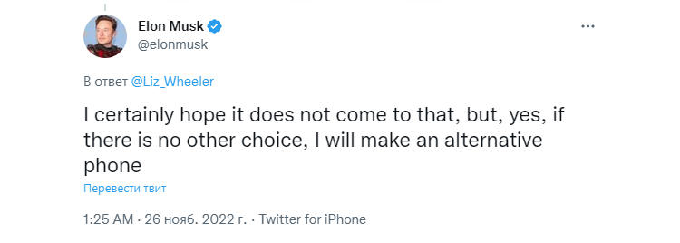 O empresário fez essa declaração em sua conta no Twitter em resposta à publicação da jornalista Liz Wheeler (Liz Wheeler) – ela sugeriu que não seria difícil para uma pessoa que “constrói foguetes para Marte” se o Twitter fosse removido da App Store e Google Play para lançar um smartphone. Ao mesmo tempo, “metade do país”, em sua opinião, desistirá de bom grado de “iPhones e Androids tendenciosos e espiões”.