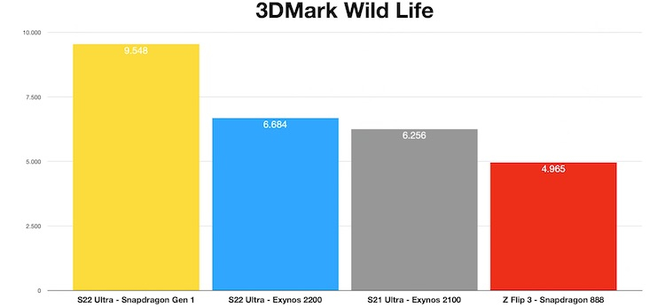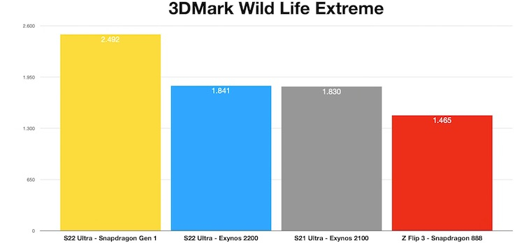 O entusiasta testou as versões Galaxy S22 Ultra baseadas nos chipsets Qualcomm e Samsung nos benchmarks gráficos 3DMark Wild Life, Wild Life Extreme e GFXBench. De acordo com os resultados, o Exynos 2200 supera o Exynos 2100 do ano passado com gráficos Arm Mali-G78 em apenas 7% no 3DMark Wild Life, enquanto perde impressionantes 30% para o Snapdragon 8 Gen 1. Em outros testes, a situação foi semelhante – o modelo do Exynos 2200 ficou muito atrás.