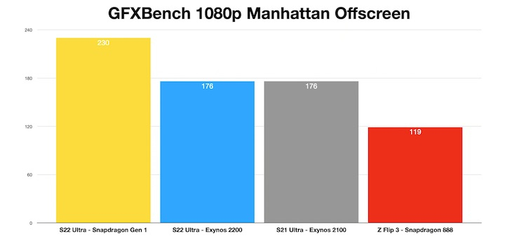 Vale a pena notar que execuções de teste individuais podem não mostrar a imagem completa, pois o desempenho gráfico móvel depende bastante das capacidades de dissipação de calor dos dispositivos em teste. É relatado que o desempenho do Snapdragon 8 Gen 1 pode diminuir visivelmente após várias execuções devido a frequências mais baixas causadas pelo calor excessivo do chip.