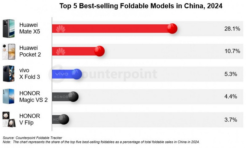 Os cinco modelos de smartphones dobráveis mais vendidos em 2024 foram responsáveis por mais de 50% de todas as vendas na China. A lista inclui dois modelos da Huawei, dois da Honor e um da Vivo. Além disso, apenas dois dispositivos do top 5 — Huawei Pocket 2 e Honor V Flip — foram feitos no formato concha, enquanto o restante pertencia à categoria de livro.