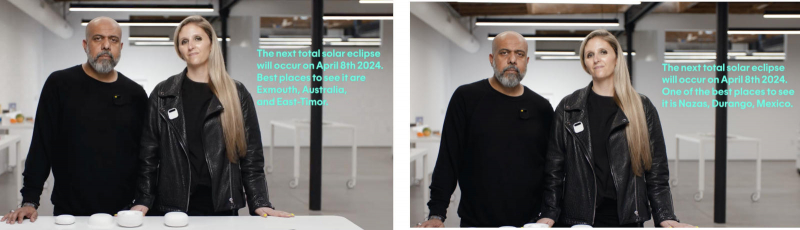 Primeiro, perguntou-se ao gadget quando ocorreria o próximo eclipse solar e onde seria melhor observá-lo. Ele respondeu que o evento ocorrerá em 8 de abril de 2024, e isso é verdade. Mas, segundo AI Pin, para observá-lo é necessário ir à Austrália e a Timor Leste, embora na realidade o eclipse só será visível na América Central e do Norte. No segundo episódio, AI Pin viu um punhado de amêndoas e perguntou quanta proteína continha. Havia cerca de 12 sementes na moldura, que na verdade contêm 3 gramas de proteína, mas o gadget responde que essa quantidade contém 15 gramas de proteína – a mesma quantidade que meio copo de amêndoas.