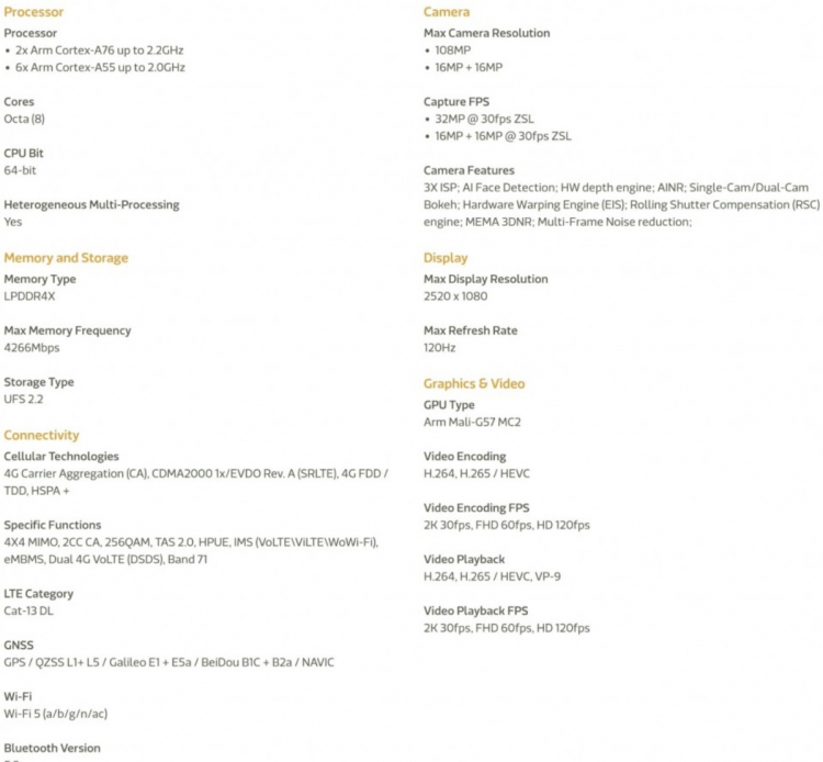 O chip suporta unidades UFS 2.2, RAM LPDDR4X, telas Full HD+ de 120Hz, bem como padrões sem fio Wi-Fi 5 e Bluetooth 5.2.