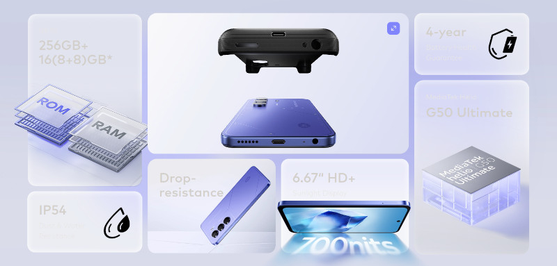 Apesar do aumento da capacidade da bateria, o dispositivo manteve dimensões equilibradas: 165,92 × 77,31 × 7,98 mm e seu peso é de 200 gramas. Esses parâmetros garantem facilidade de uso sem tornar o smartphone muito volumoso. O estojo de carregamento externo aumenta a duração da bateria, mas ao mesmo tempo torna o design um pouco mais robusto. A Itel enfatiza que, mesmo sem o módulo plug-in, o Power 70 é capaz de funcionar por vários dias sem recarga, o que o torna uma escolha ideal para usuários que valorizam uma bateria de longa duração.
