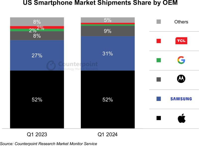O mercado de smartphones dos EUA tem diminuído pelo sexto trimestre consecutivo, conforme determinado por representantes da Counterpoint Research, e de acordo com os resultados do primeiro trimestre, as remessas de dispositivos relevantes diminuíram 8% ano a ano, principalmente para o em detrimento de modelos baratos sem suporte 5G. A empresa coreana Samsung conseguiu aumentar a sua participação no mercado de smartphones dos EUA para 31%.