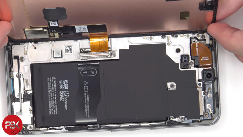 A desmontagem começa com a separação cuidadosa da tela do smartphone – os autores da desmontagem mostraram um leitor de impressão digital na parte traseira da tela. O osso duro de roer foi a bateria firmemente colada, que indicava uma capacidade de 4.485 mAh. Para retirar a bateria tive que dissolver a cola com álcool isopropílico e aplicar força.