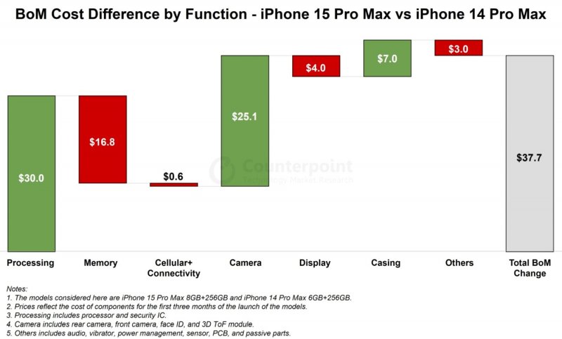 De acordo com a empresa de análise Counterpoint Research, o custo total de materiais (lista de materiais, BoM) para a produção da versão de 256 GB do iPhone 15 Pro Max é US$ 37,7 ou 8% maior do que para a versão de 256 GB do iPhone 14 Pro Max, lançado no ano passado. Considerando que o preço inicial de varejo do iPhone 15 Pro Max é US$ 100 mais alto que seu antecessor, as vendas do novo carro-chefe trarão lucro significativamente maior para a Apple.