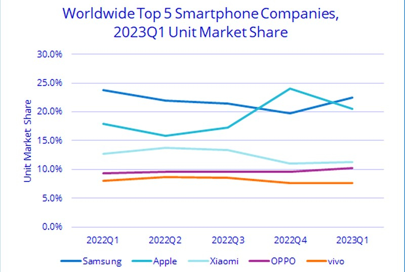 Em termos de participação de mercado, apesar da queda, a Samsung recuperou a liderança com 22,5% do mercado global de smartphones, enquanto a Apple caiu para a segunda posição com 20,5%. Xiaomi, Oppo e Vivo mantiveram a terceira, quarta e quinta linhas da classificação, respectivamente.