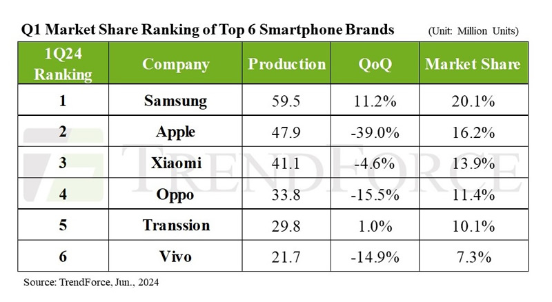 No primeiro trimestre, os líderes em participação de mercado foram Samsung (20,1%), Apple (16,2%), Xiaomi (13,9%), OPPO (11,4%), Transsion (10,1%) e Vivo (7,3%). Estas seis empresas controlam cerca de 80% do mercado global de smartphones.