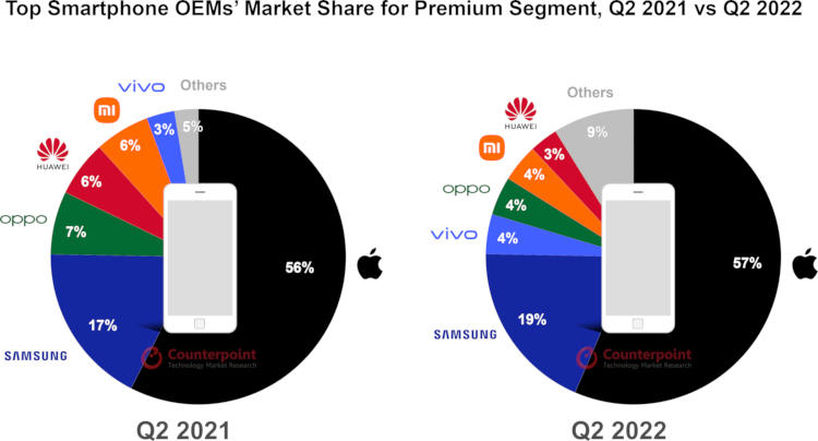 A Apple manteve a liderança do segmento premium, aumentando sua participação para 57% devido aos dispositivos 4G. Ao longo do trimestre, a empresa apresentou fortes vendas nos EUA e realizou diversas promoções, com o que conseguiu proteger a alta demanda de fatores macroeconômicos negativos. No último trimestre, a Apple também estabeleceu um recorde de número de usuários que mudaram de dispositivos Android para o iPhone, principalmente devido ao crescimento estável das economias emergentes.