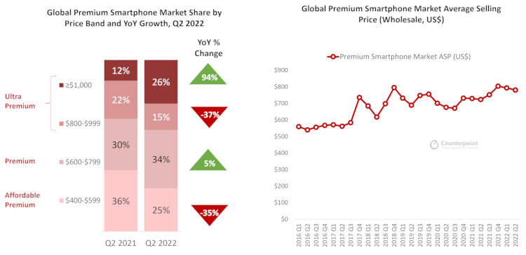 O preço médio de venda (ASP) de smartphones premium (a um preço de atacado de US$ 400) no segundo trimestre de 2022 aumentou 8% ano a ano e atingiu um recorde de US$ 780, de acordo com a Counterpoint Research, citando seu Market Pulse Service.