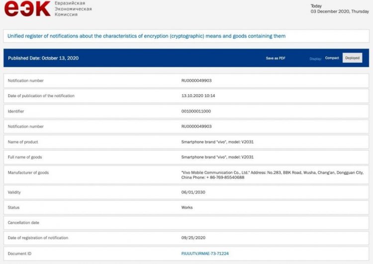 De acordo com as informações disponíveis, o dispositivo com o número do modelo V2031 foi registrado no banco de dados da Eurasian Economic Commission.