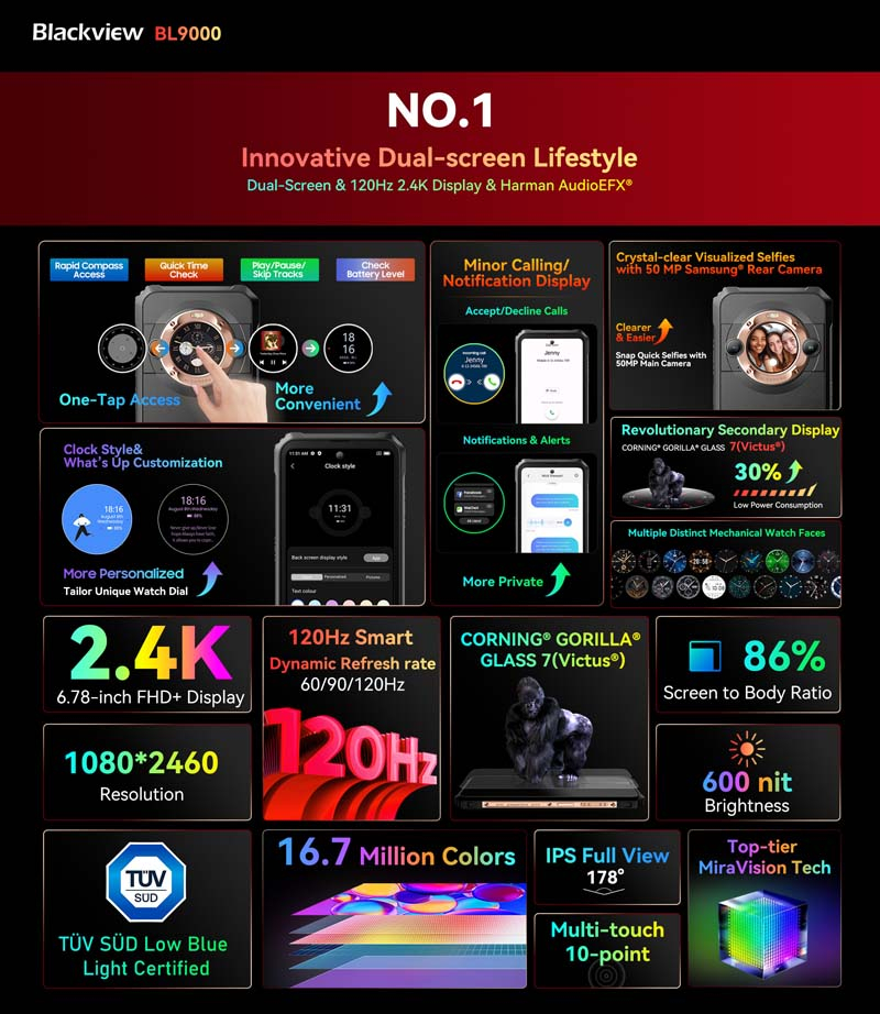 O Blackview BL9000 está equipado com uma tela IPS de 6,78 polegadas com resolução de 2,4K FHD+ (2460 × 1080 pixels) e taxa de atualização dinâmica de 120 Hz, proporcionando imagens nítidas e suaves. O brilho da tela é de 600 cd/m2, portanto o smartphone pode ser usado mesmo sob luz solar direta. A tela suporta 16,7 milhões de cores e possui ângulos de visão de 178° em ambos os planos. O display também é certificado pela TÜV TÜV, que confirma baixos níveis de luz azul prejudicial aos olhos e ausência de cintilação, permitindo o uso do aparelho por longos períodos de tempo. O durável Corning Gorilla Glass 7 (Victus) protege a tela contra arranhões e danos.