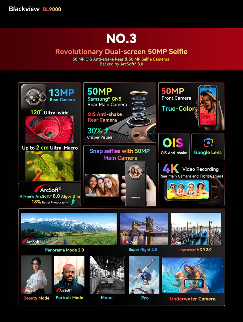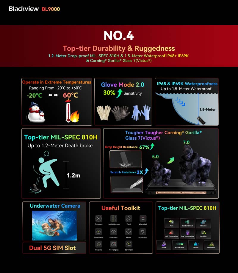 Em termos de proteção contra umidade, poeira e choques, o Blackview BL9000 atende aos padrões IP68, IP69K e MIL-STD-810H, o que permite que seja utilizado nas condições mais adversas, leve-o consigo para trabalhar em um canteiro de obras ou em uma loja quente, bem como em caminhadas em qualquer clima.