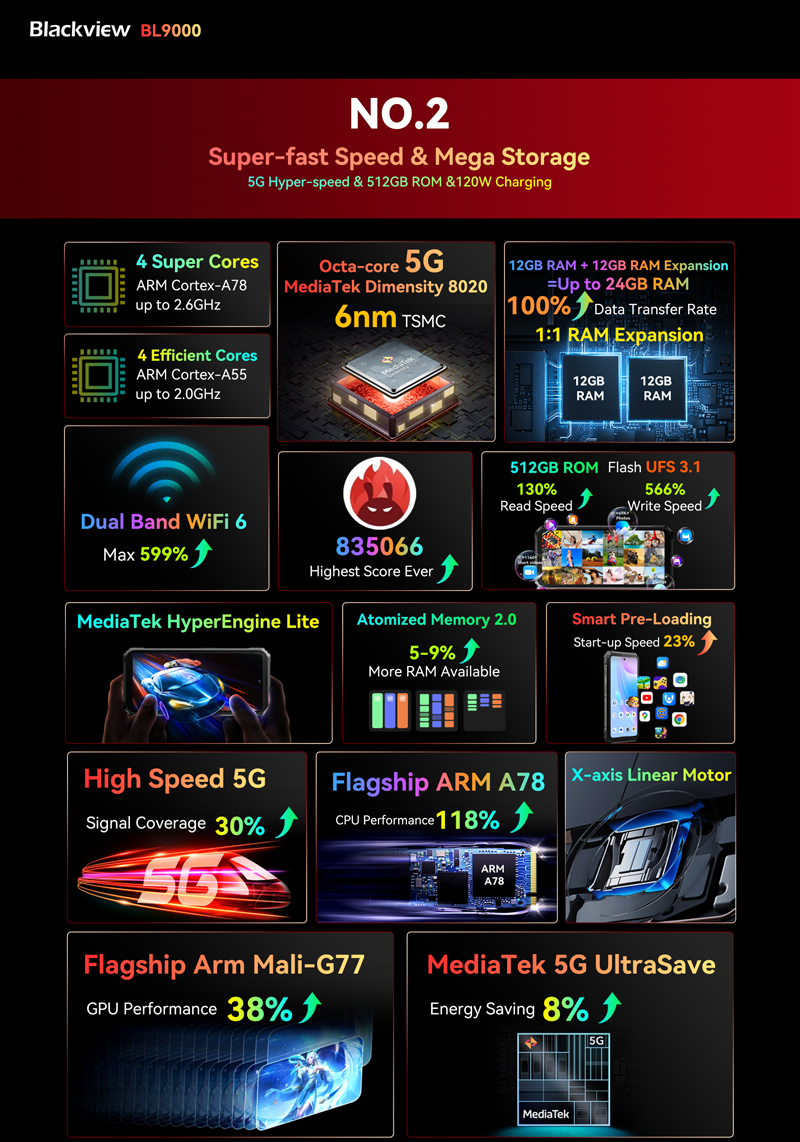 O smartphone Blackview BL9000 é baseado no processador Dimensity 8020 5G de oito núcleos, que, combinado com até 24 GB de RAM (incluindo 12 GB de memória virtual), oferece desempenho de alto desempenho ao executar aplicativos do dia a dia, jogos exigentes e assistir streaming vídeos. A capacidade da unidade flash é de 512 GB.