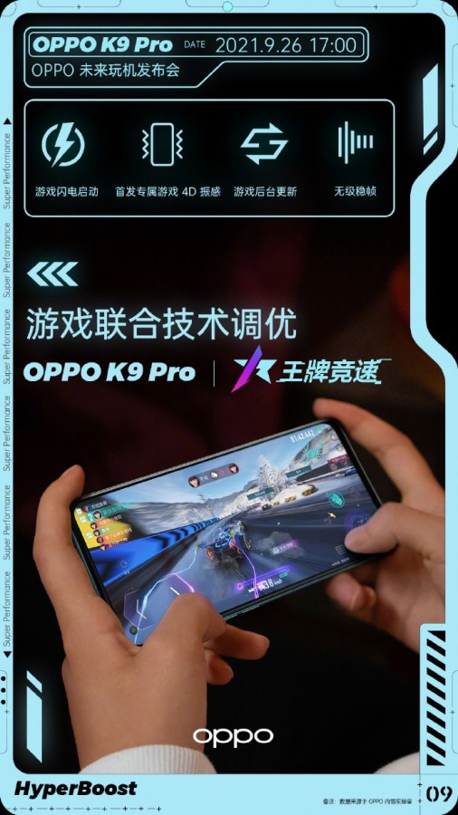 A Oppo confirmou o lançamento da variante K9 Pro 8GB / 128GB. Uma vez que o smartphone está posicionado como um smartphone para jogos, ele virá com feedback tátil 4D Vibration para uma experiência de jogo mais envolvente.