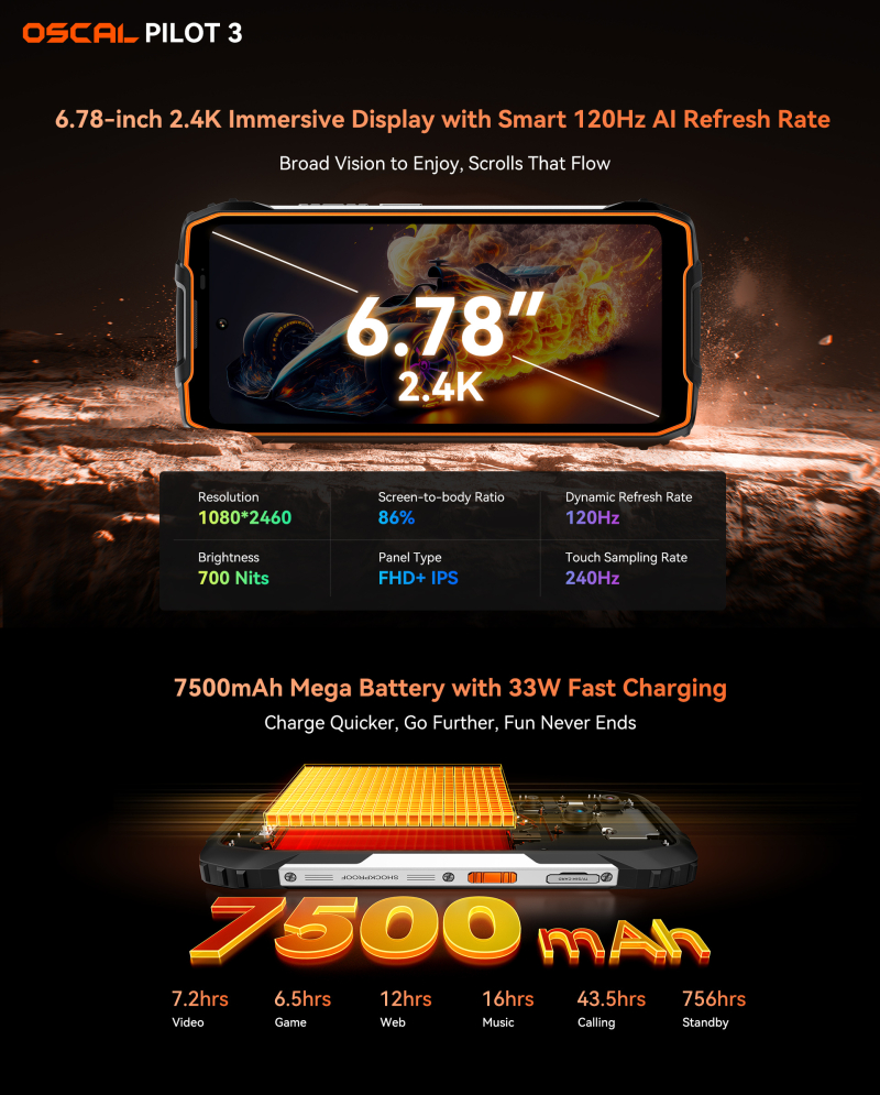 O smartphone OSCAL PILOT 3 atende aos padrões IP68, IP69K e MIL-STD-810H de proteção contra umidade, poeira e impactos, o que o torna capaz de suportar submersão por meia hora a uma profundidade de 2 m, queda de 8 m e pressão de 1.000 kg sem comprometer sua funcionalidade. Maior confiabilidade e durabilidade o tornam um companheiro indispensável para caminhadas e viagens, bem como para os amantes de esportes radicais e montanhismo.
