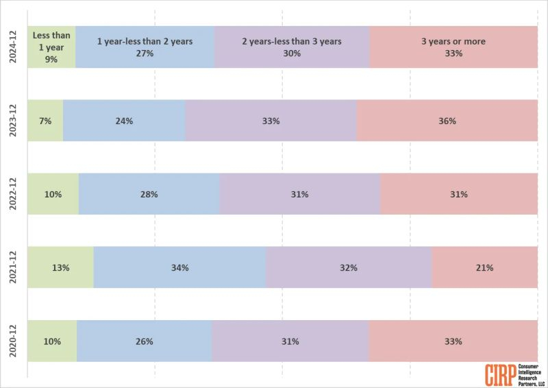 Mais especificamente, a pesquisa do CIRP mostra um aumento na proporção de proprietários de iPhone que decidem atualizar para um novo modelo após possuírem o anterior por menos de dois anos. Entre os compradores recentes de novos iPhones, 36% eram essas pessoas no final do último trimestre. No ano anterior, sua participação não ultrapassou 31%. Ao mesmo tempo, a parcela de proprietários de iPhone que possuíam o modelo anterior por dois a três anos (de 33 para 30%) e mais de três anos (de 36 para 33%) diminuiu.