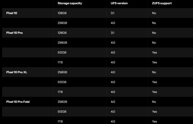 Curiosamente, o Google não mencionou a inteligência artificial em sua propaganda do ZUFS. A empresa apenas afirmou que a tecnologia “oferece tempos de resposta e inicialização de aplicativos ainda mais rápidos para usuários que exigem o máximo desempenho de armazenamento interno”. Apesar das vantagens óbvias, o suporte ao ZUFS não está disponível em todos os modelos de smartphones Pixel 10. Nos EUA, essa inovação estará disponível para proprietários dos modelos Pixel 10 Pro e Pixel 10 Pro XL com pelo menos 512 GB de armazenamento. Informações mais detalhadas sobre quais smartphones são equipados com chips UFS 4.0 e quais são compatíveis com o ZUFS são fornecidas na tabela abaixo.