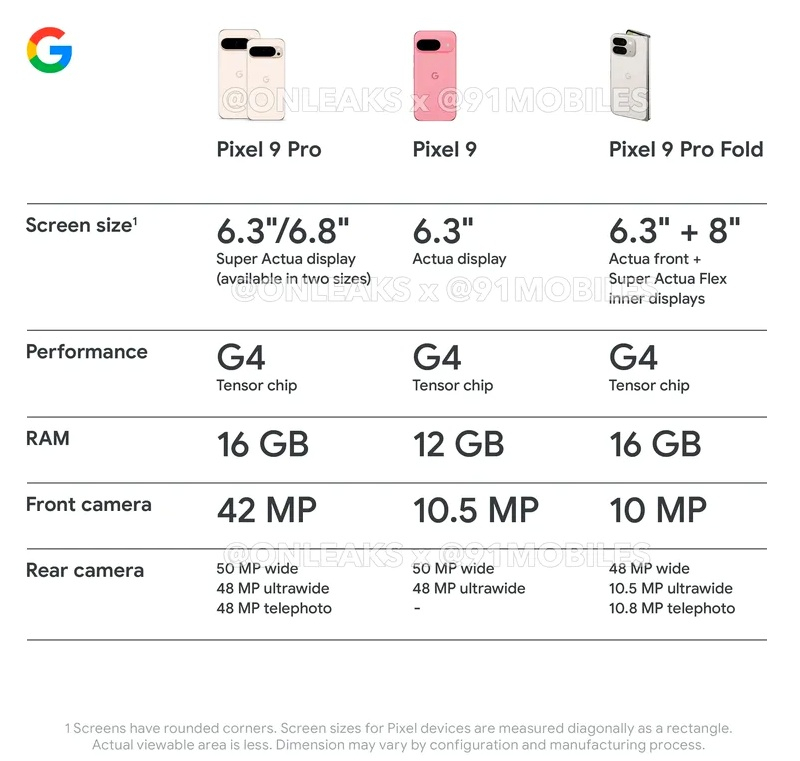A julgar pela tabela publicada, o Pixel 9 básico terá tela de 6,3 polegadas e 12 GB de RAM, enquanto o Pixel 9 Pro pode vir em telas de 6,3 e 6,8 polegadas com 16 GB de RAM. O Pixel 9 Pro Fold dobrável será equipado com telas externas de 6,3 polegadas e dobráveis de 8 polegadas e 16 GB de RAM. Espera-se que todos os dispositivos sejam construídos no novo chip Google G4 Tensor.