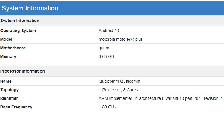 A imagem indica a presença do processador Snapdragon 460. Esse chip foi anunciado em janeiro, mas os primeiros aparelhos baseados nele entrarão no mercado apenas no final deste ano. O processador contém oito núcleos de processamento com uma velocidade de clock de até 1,8 GHz e um acelerador gráfico Adreno 610. Comunicações móveis 5G não são suportadas. A propósito, o benchmark Geekbench indicava anteriormente o uso deste chip no Moto E7 Plus.