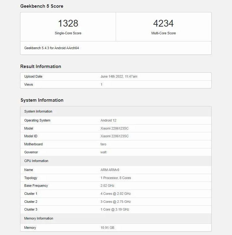 A próxima novidade tem o código 2206123SC. Ele será baseado no processador Qualcomm Snapdragon 8+ Gen 1. O chip combina oito núcleos Kryo com uma velocidade de clock de até 3,2 GHz, um acelerador gráfico Adreno de nova geração e um modem Snapdragon X65 5G.
