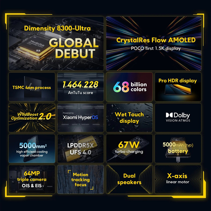 O smartphone Poco X6 Pro 5G está equipado com um poderoso processador MediaTek Dimensity 8300-Ultra de oito núcleos de 4 nm com uma frequência de clock de até 3,35 GHz e um acelerador gráfico Arm Mali-G615 MC6, capaz de fornecer, junto com LPDDR5X RAM até 12 GB, o lançamento de aplicativos que consomem muitos recursos e suaviza o andamento dos jogos. A capacidade da unidade flash UFS 4.0 é de até 512 GB. Graças ao eficiente sistema de resfriamento LiquidCool Technology 2.0 com uma grande câmara de vapor, o processador, a bateria e a tela estão em uma temperatura ideal e funcionando independentemente da carga.